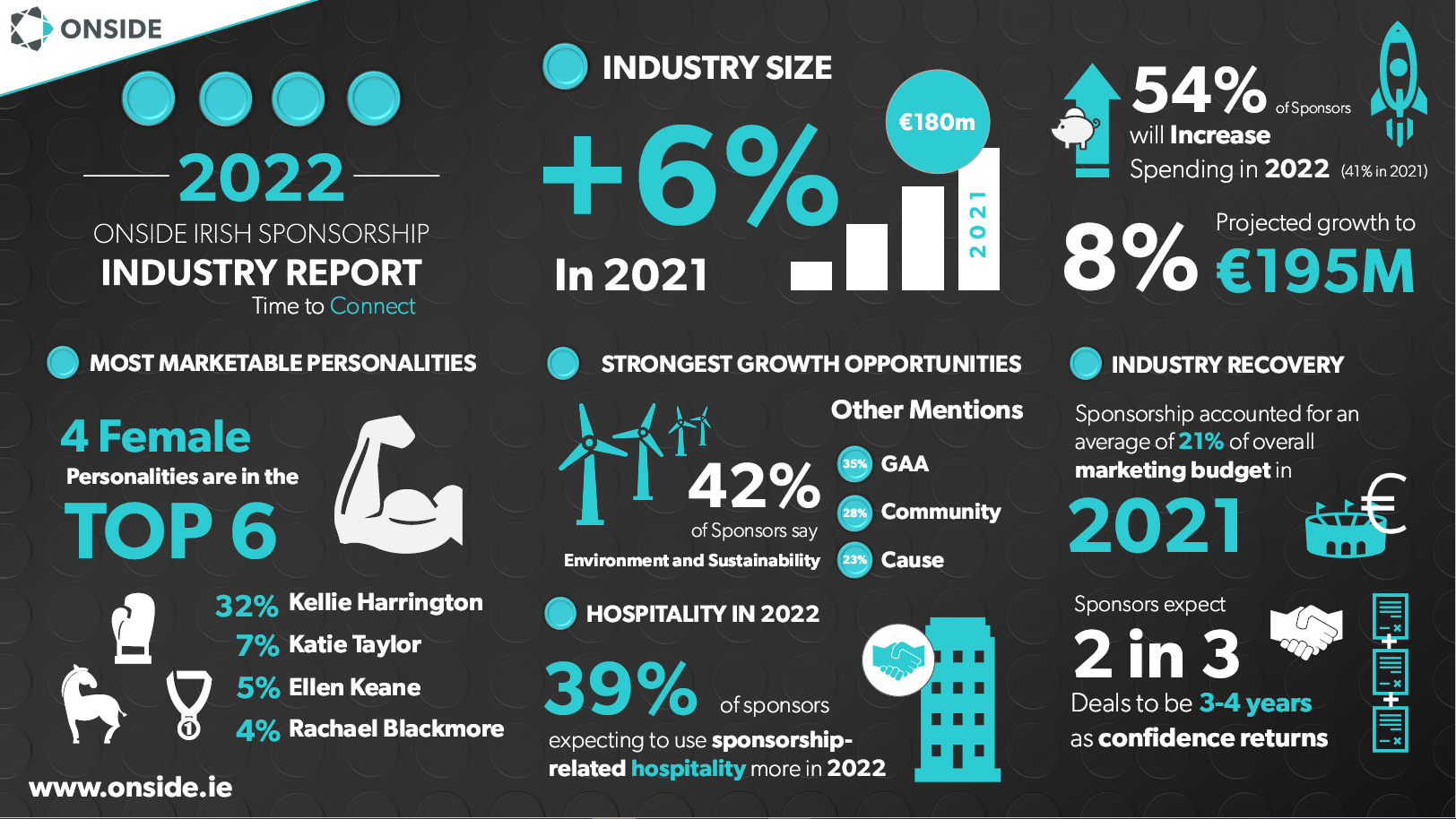 The Irish sponsorship industry grew by 6% to reach €180m in 2021, and while the sector’s size has yet to return to pre-pandemic levels, the 16th annual ONSIDE Irish Sponsorship Industry Survey estimates there will be further growth of 8% in 2022 to €195m, a step closer to the €200m threshold first reached in 2018.